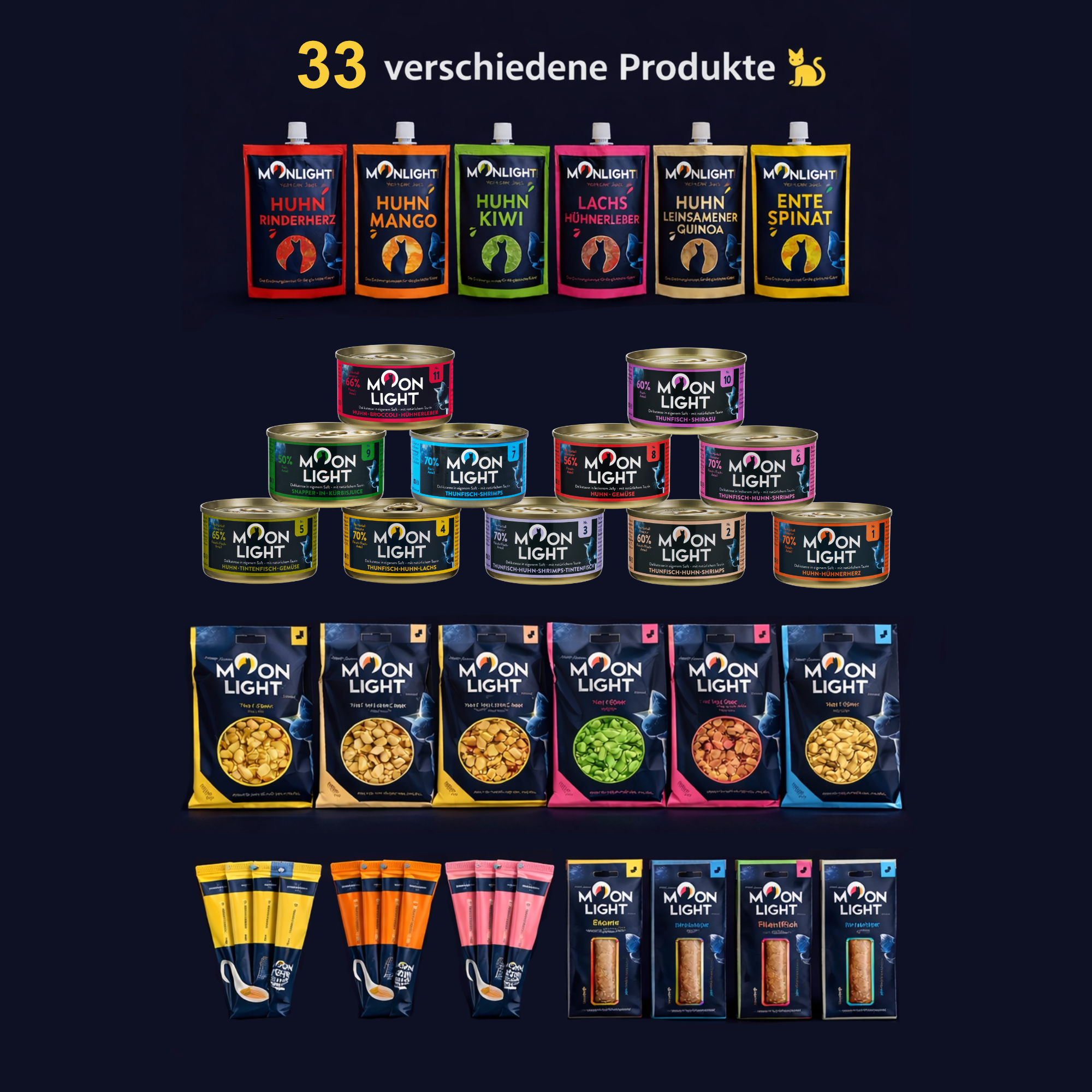 Ideal für Katzenbesitzer, die die verschiedenen Moonlight-Dinner Spezialitäten kennenlernen möchten und ihrer Katze unterschiedliche Geschmacksrichtungen anbieten wollen.