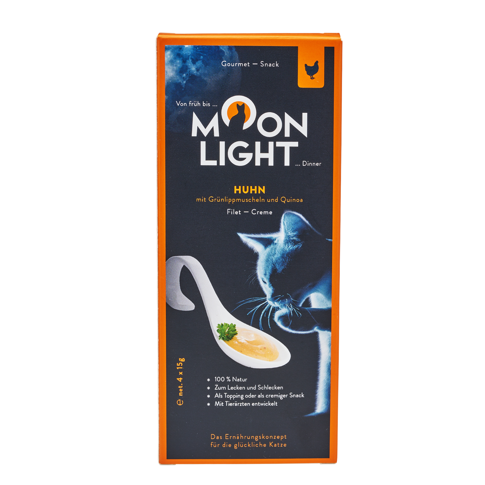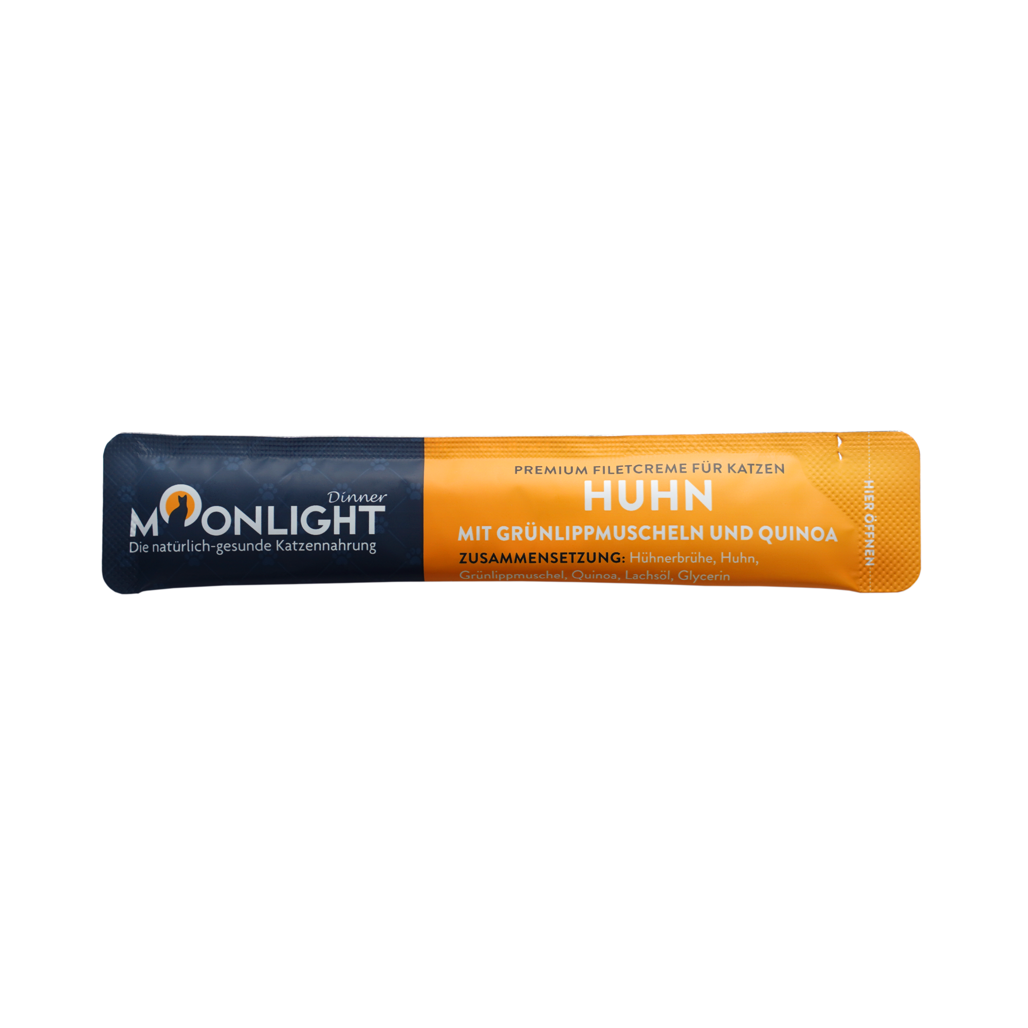 HEISSER TIPP - ab ins Gefrierfach = Katzen-Eis - pures Schleckvergnügen für heiße TageMoonlight-Dinner Filetcreme eignet sich perfekt als kleine, artgerechte Zwischenmahlzeit oder Belohnung. Leckeres Huhn, veredelt mit den Superfoods Grünlippmuscheln und Quinoa verwöhnt Vierbeiner jeden Alters.