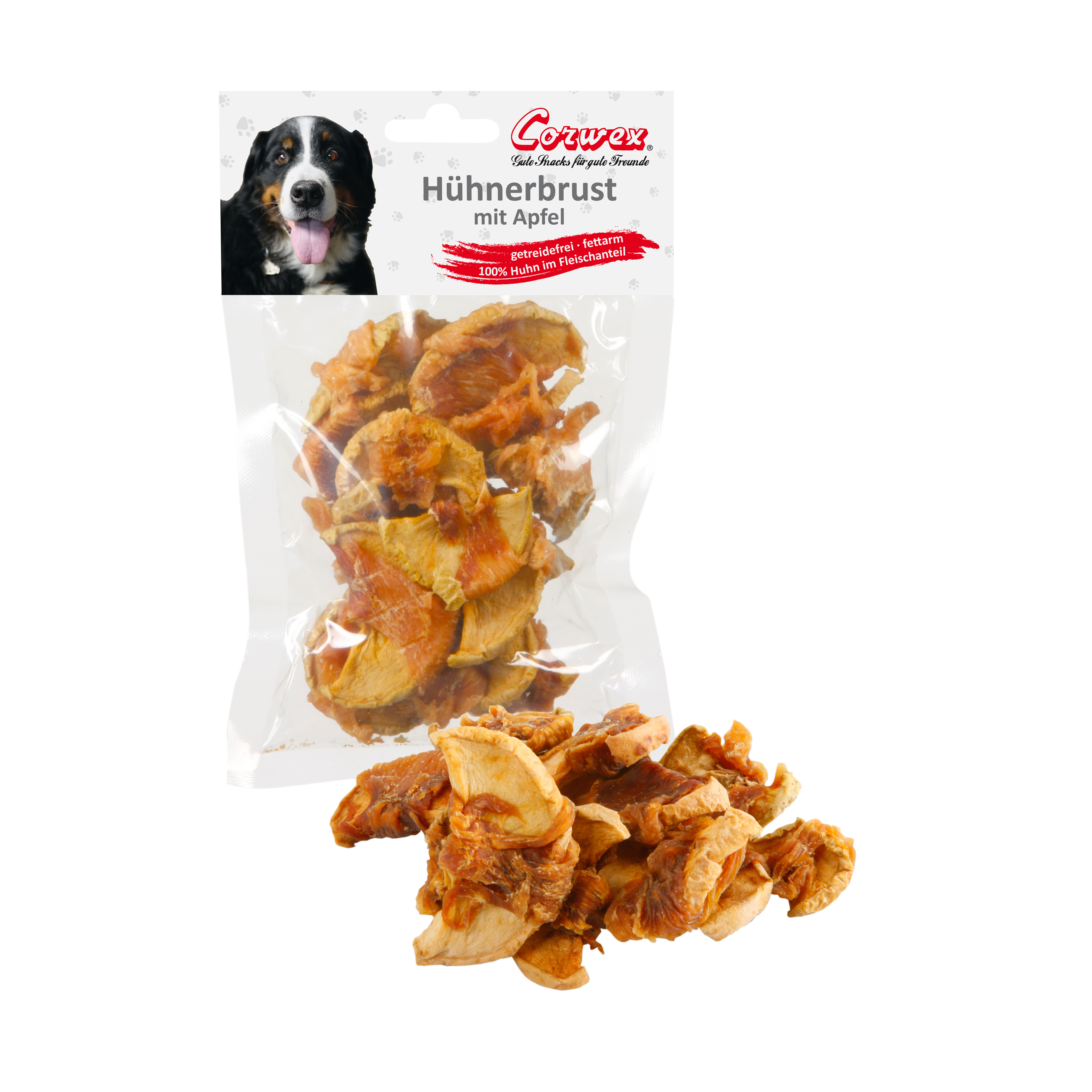 Hühnerbrustfilet 72,3%, Apfel 25%, Sorbit, Kartoffelstärke, Mineralstoffe